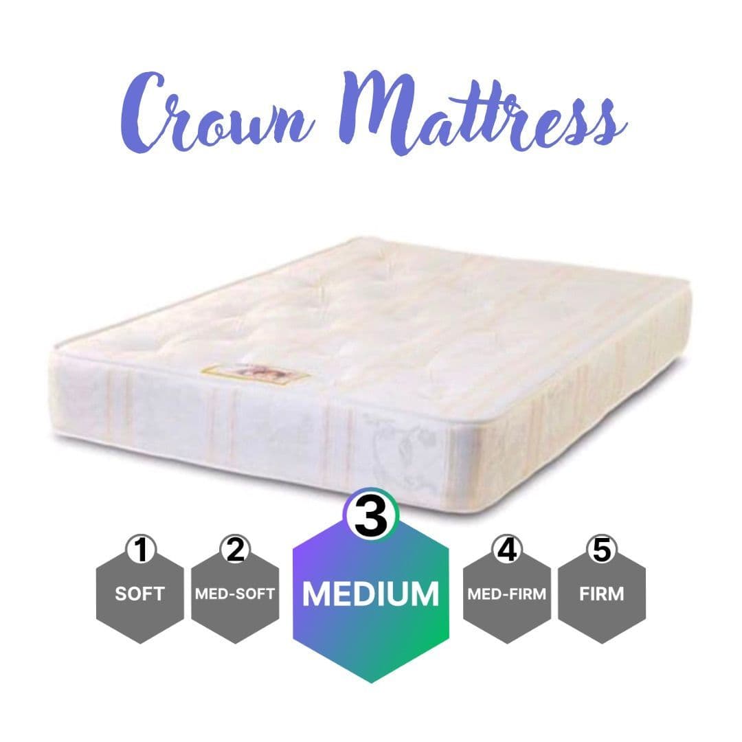 The Crown offers a step away from budget territory while not compromising affordability. It is a great mid firmness mattress option with a 10 inches deep Bonnell sprung frame padded out with luxury polyester fillings, encapsulated in a soft Damask fabric and tufted for extra security offering great comfort for value.